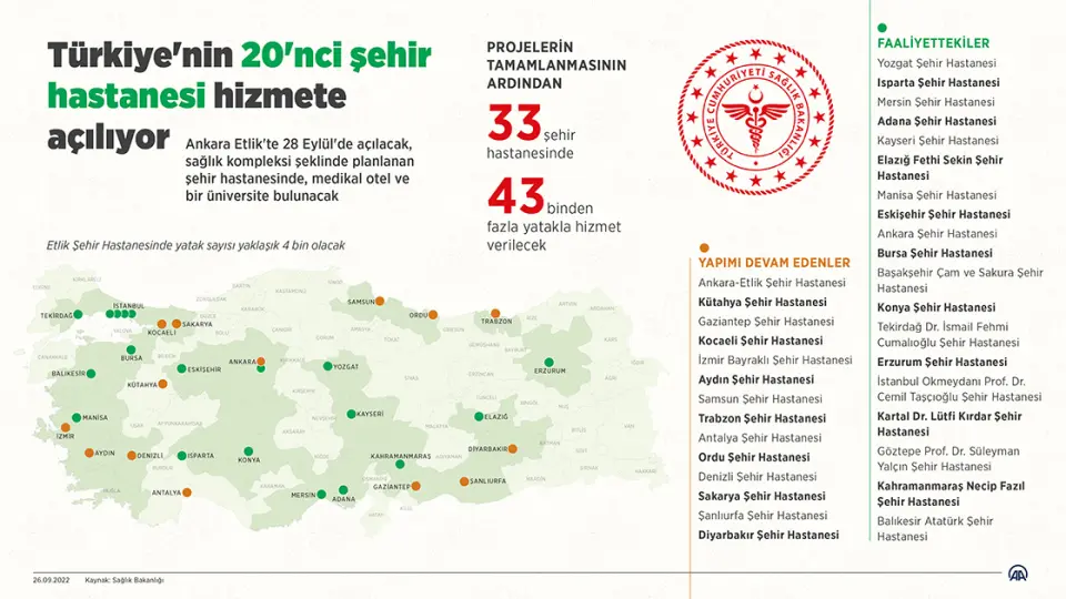 Türkiye'nin ilk şehir hastanesinin 2017'de Yozgat'ta faaliyete geçmesinden bugüne 19 şehir hastanesi açıldı. Türkiye'nin en büyük şehir hastaneleri arasına girecek Etlik Şehir Hastanesi, 28 Eylül Çarşamba günü Cumhurbaşkanı Recep Tayyip Erdoğan'ın da katılması beklenen törenle hizmete alınacak.