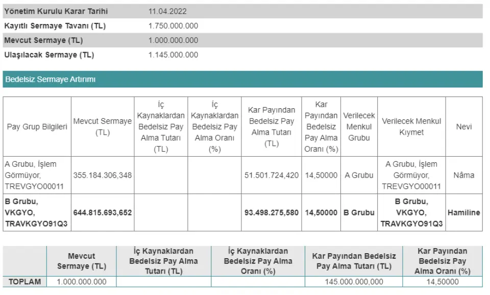 31 Mart 2022 tarihinde gerçekleşen ve 06 Nisan 2022 tarihinde İstanbul Ticaret Müdürlüğü tarafından tescil edilen, Olağan Genel Kurul Toplantısında alınan karar gereği, net karın % 31.0526'sı ve sermayenin % 14,50'si oranında, 145.000.000,-TL temettünün bedelsiz hisse senedi olarak dağıtılması hususunda, Şirketimiz Yönetim Kurulu tarafından 11 Nisan 2022 tarihinde karar alınmış ve aynı tarihte Sermaye Piyasası Kuruluna başvurulmuştur.