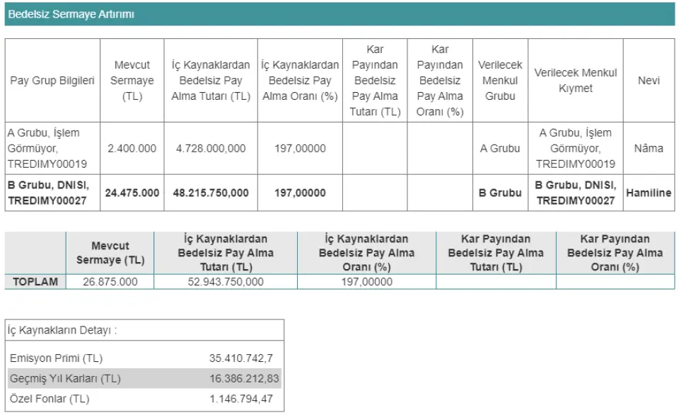 Şirketlerin kendi iç kaynaklarını (emisyon primi, yeniden değerleme değer artışı, yedekler, iştirak ve duran varlık satış karları, temettü vb) Kullanarak yapmış oldukları ve ortaklarından ilave kaynak talep etmeden bedelsiz olarak hisse senedi dağıttıkları sermaye artırım türüdür. Hesaplara otomatik olarak yansıtılır. Yatırımcılarımızın herhangi bir işlem yapmasına gerek yoktur. Kayıtlı sermaye sisteminde bedelsiz hisse senetleri, sermaye artırımına gidilen günden (T+2) iki iş günü sonra hesabınıza geçer.