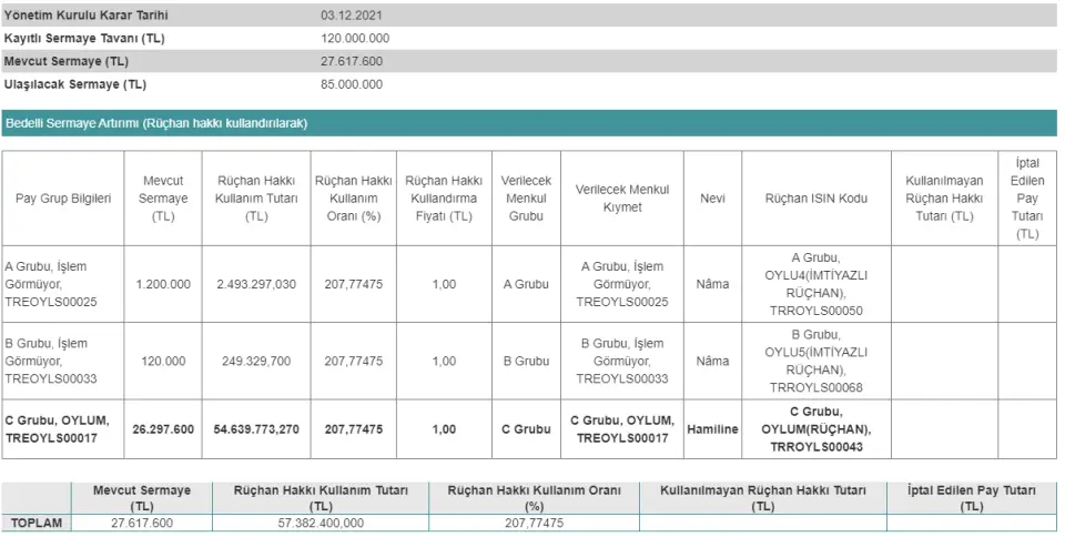 OYLUM SINAİ YATIRIMLAR A.Ş. OYLUM şirketinin yaptığı KAP açıklamasına göre;