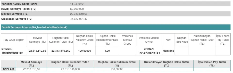 BİRLİK MENSUCAT TİCARET VE SANAYİ İŞLETMESİ A.Ş. BRMEN şirketinin yaptığı KAP açıklamasına göre;