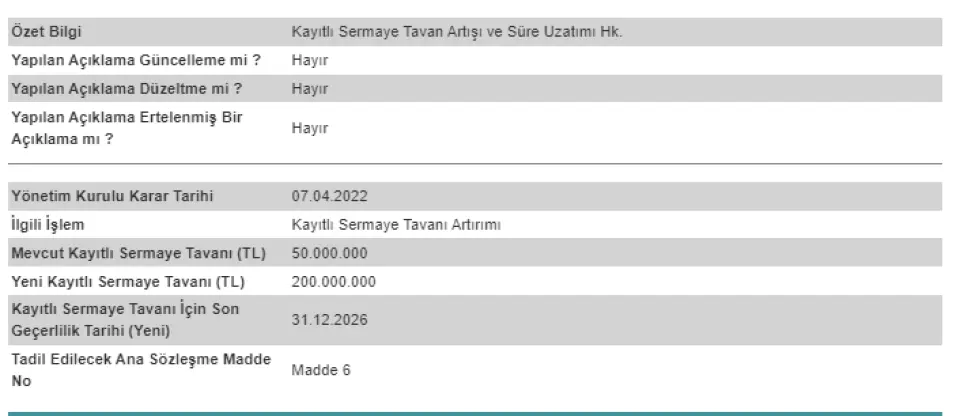 Şirketimiz esas sözleşmesinin "Sermaye ve Hisse Senetleri" başlıklı 6.maddesinde kayıtlı sermaye sistemi içerisinde bulunan mevcut 50.000.000 TL tutarındaki kayıtlı sermaye tavanının 200.000.000 TL'na yükseltilmesine ve Sermaye Piyasası Kurulu'nun II-18.1 sayılı Kayıtlı Sermaye Sistemi Tebliği uyarınca; şirketimizin mevcut kayıtlı sermaye tavanı geçerlilik süresinin de bu kapsamda 2022-2026 yıllarını kapsayacak şekilde güncellenmesine,