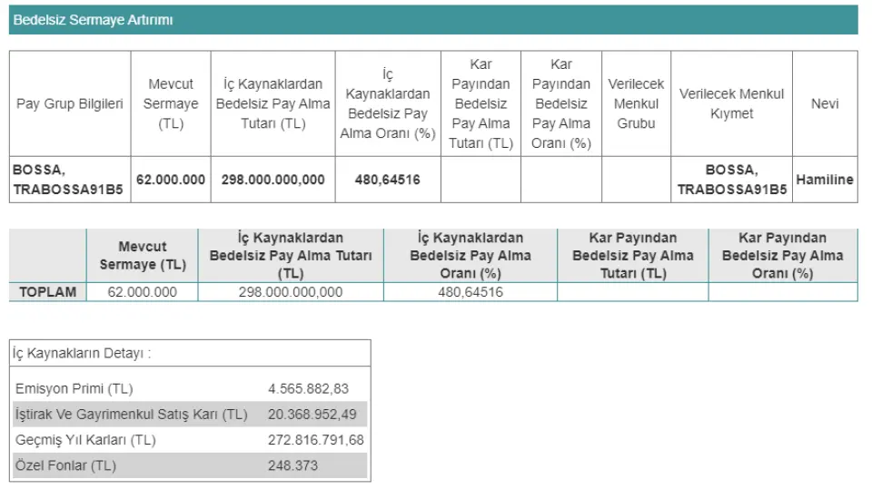 BOSSA TİCARET VE SANAYİ İŞLETMELERİ T.A.Ş. BOSSA şirketinin Kamuya Aydınlatma Platform'una yaptığı açıklama şu şekilde;