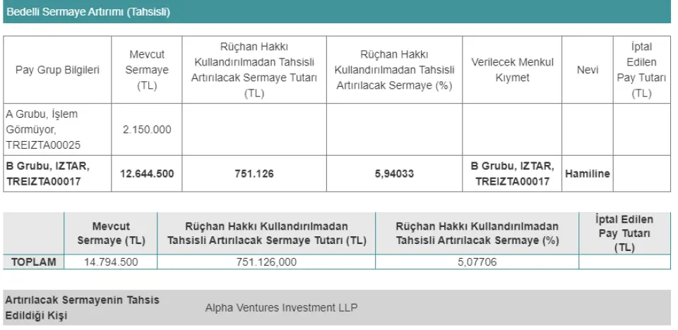 IZTAR tahsisli sermaye artırımı onay detaylarına göre;