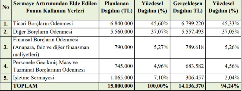 artırımından elde edilen 14.999.995,92-TL fonun kullanım yerleri detayı, bu rapor tarihi itibariyle