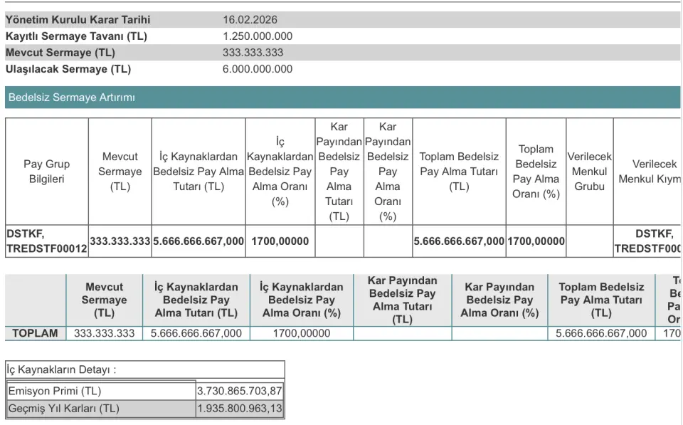 DSTKF yatırımcıları bu bedelsiz sermaye artırımında hesaplarındaki lotların ne olacağını merak ediyor. Şirketin %1700'lük bedelsiz sermaye artırımı, Sermaye Piyasası Kurulu (SPK) tarafından onay alırsa; elinde hissesi olan yatırımcıların lot sayısı 18 katına çıkacak.