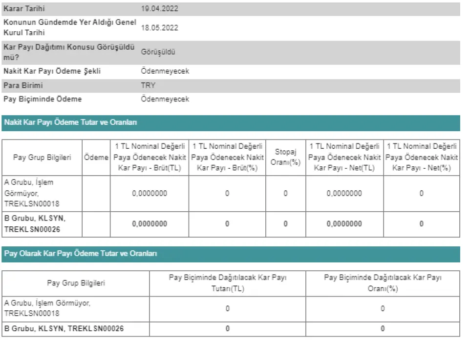 Şirketimizin 18.05.2022 tarihinde yapılan 2021 yılı olağan genel kurul toplantısında, Yönetim Kurulunun 19.04.2022 tarihli teklifinde yer alan, Sermaye Piyasasında Finansal Raporlamaya İlişkin Esaslar Tebliği (II-14.1) hükümleri dâhilinde, Türkiye Muhasebe Standartları ve Türkiye Finansal Raporlama Standartları (TMS/TFRS)'na uygun olarak hazırlanan, bağımsız denetimden geçmiş, 01.01.2021-31.12.2021 hesap dönemine ait finansal tablolarına göre Şirketimizin Sermaye Piyasası düzenlemeleri çerçevesinde hazırlanan ve Eren Bağımsız Denetim Anonim Şirketi tarafından denetlenen finansal tablolarımıza göre 2021 yılında net dönem kârının 3.258.986 TL olduğu, Vergi Usul Kanununa göre hazırlanan mali tablolarda ise 30.069.485.12-TL zarar oluştuğundan 2021 yılında ait net dönem karının dağıtılmayarak olağanüstü yedek akçe olarak ayrılmasına ilişkin önerisin kabul edilmesine karar verilmiştir.