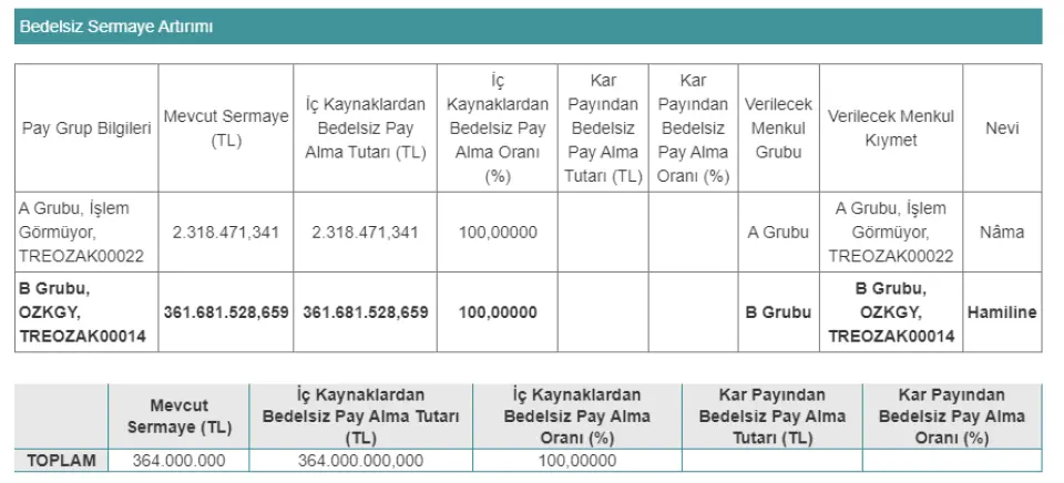 Yönetim Kurulumuzun 29.03.2022 tarihli kararı ile, Şirketimizin 04.03.2022 tarihinde aldığı 1.000.000.000 TL olan Kayıtlı Sermaye Tavanı içerisinde ödenmiş 364.000.000 TL sermayesinin, 364.000.000 TL artırılarak 728.000.000 TL'ye tamamı olağanüstü yedek akçelerden karşılanacak şekilde yapılacak olan bedelsiz sermaye artırımına ilişkin alınan yönetim kurulu kararına istinaden sermayeyi temsil eden A grubu nama yazılı 2.318.471,34 adet pay karşılığı 2.318.471,34 TL'lik payın 4.636.942,68 adet ve 4.636.942,68 TL olarak ; B grubu hamiline yazılı 361.681.528,66 adet pay karşılığı 361.681.528,66 TL'lik payın 723.363.057,32 adet pay karşılığı 723.363.057,32 TL olarak oluşmasına karar verilmiştir.