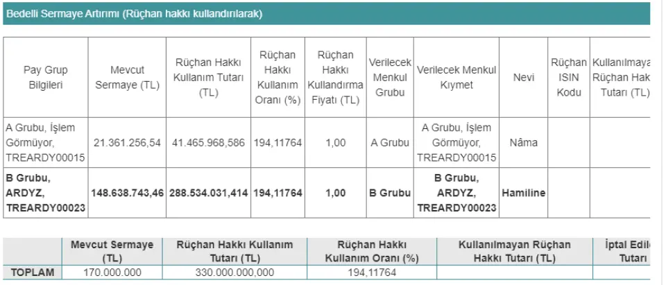 4. Şirketimizin nakit olarak artırılan 330.000.000 TL tutarındaki sermayeyi temsil eden paylarına ilişkin yeni pay alma haklarının 1,00 TL'den 15 gün süreyle kullandırılmasına, bu sürenin son günü resmi tatile rastlaması halinde, yeni pay alma hakkı kullanım süresinin, izleyen iş günü akşamı sona ermesine, mevcut pay sahiplerinin rüçhan hakları karşılığında A grubu nama yazılı paylar için A grubu nama, B grubu hamiline yazılı paylar için B grubu hamiline yazılı pay verilmesine,