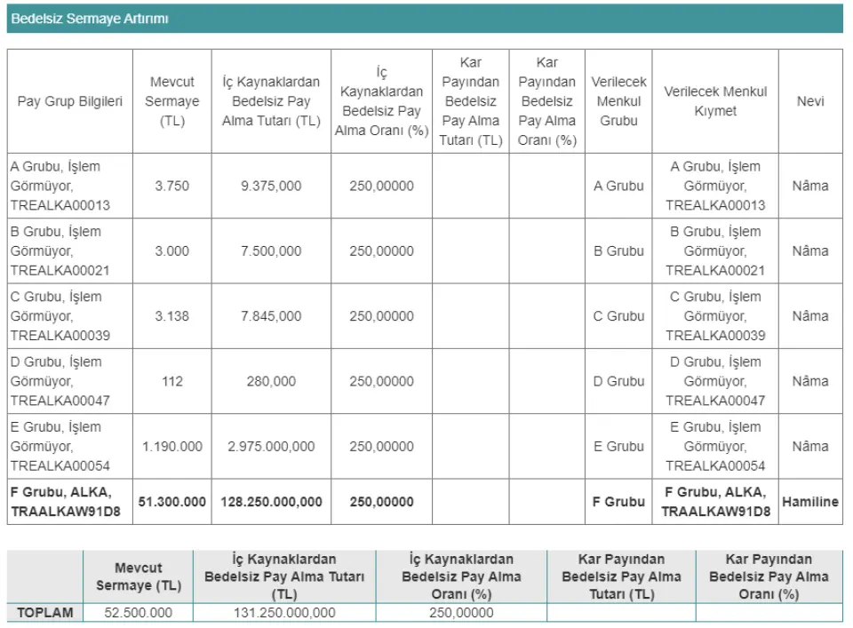 Şirketin sermayesinin 52.500.000.-TL (Elliikimilyonbeşyüzbin Türk Lirası)'dan, tamamı müsait özkaynak kalemlerinden; 99.846.844,21 TL' sı Olağanüstü Yedeklerden, 23.647.927,87 TL'sı Sermaye Düzeltmesi Olumlu Farklarından ve 7.755.227,92 TL'sı Gayrimenkul Satış Kazançlarına ait fondan karşılanmak üzere, toplamı 131.250.000-TL (Yüzotuzbirmilyonikiyüzellibin Türk Lirası)'sı bedelsiz sermeye artırım yöntemi ile ilave edilerek 183.750.000.-TL (Yüzseksenüçmilyonyediyüzellibin Türk Lirası)'sına çıkarılmasına, artan 131.250.000-TL (Yüzotuzbirmilyonikiyüzellibin Türk Lirası)'sına tekabül eden 13.125.000.000 adet hissenin mevcut ortaklara bedelsiz dağıtılmasına,