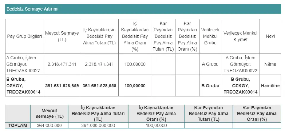Borsa İstanbul'da işlem gören hisselerden Özak Gayrimenkul bedelsiz sermaye artırımı SPK tarafından onaylandı. Sermaye artırımı yapacak olan Özak Gayrimenkul %100 oranında bedelsiz pay dağıtacak. Sermaye artırım oranın ne kadar? Bedelsiz ne zaman başlayacak? Hisse detayları neler? Tüm detayları ile... Bedelsiz sermaye artırımı onay aldı