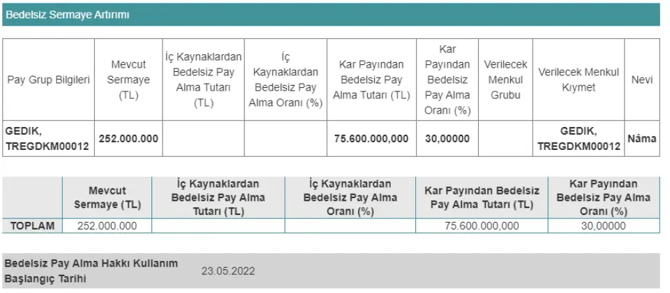 Şirketimizin 600.000.000,-TL kayıtlı sermaye tavanı içerisinde 252.000.000,-TL olan çıkarılmış sermayesinin, tamamı 2021 yılı kar payından karşılanmak üzere 75.600.000,-TL artırılarak 327.600.000,-TL'ye çıkarılmasına ilişkin başvurumuzun Sermaye Piyasası Kurulu (SPK) tarafından uygun görülerek 12.05.2022 tarihinde onaylandığı ve bedelsiz pay alma hakkı kullanım başlangıç tarihi 23.05.2022 olarak belirlendiği duyurulmuştur.