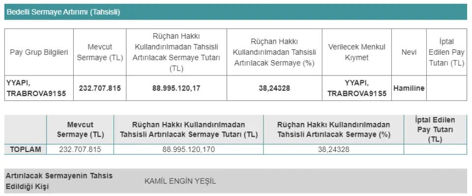 Şirketimiz Yeşil Yapı Endüstrisi A.Ş. tarafından ihraç edilen 88.995.120,170 TL nominal değerli payların 1 TL nominal değerli pay için 1,19 TL fiyat üzerinden toplam satış hasılatı 105.904.193 TL olacak şekilde Kamil Engin Yeşil'e tahsisli olarak satılması işlemi 26.04.2022 tarihinde Borsa İstanbul Toptan Alış Satış Pazarı'nda gerçekleşmiş olup, tahsisli sermaye artırımı işlemi tamamlanmıştır.