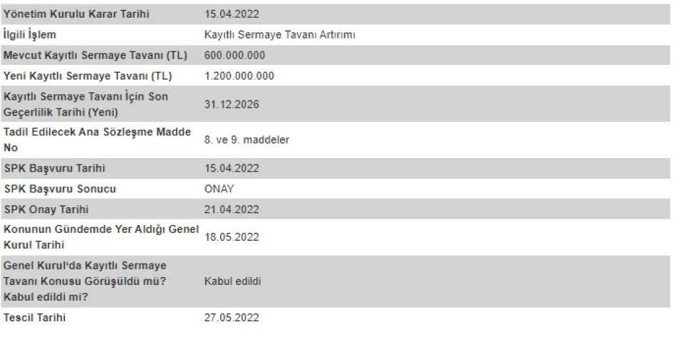 Şirketimizin kayıtlı sermaye tavan tutarının 600.000.000 TL'den 1.200.000.000 TL'ye yükseltilmesi ve kayıtlı sermaye tavanı geçerlilik süresinin 2022-2026 yılları olarak değiştirilmesine ilişkin esas sözleşmemizin 8. ve 9. maddelerinin tadili hususu gündemin 11. maddesinde görüşülerek oy çokluğuyla kabul edilmiştir.