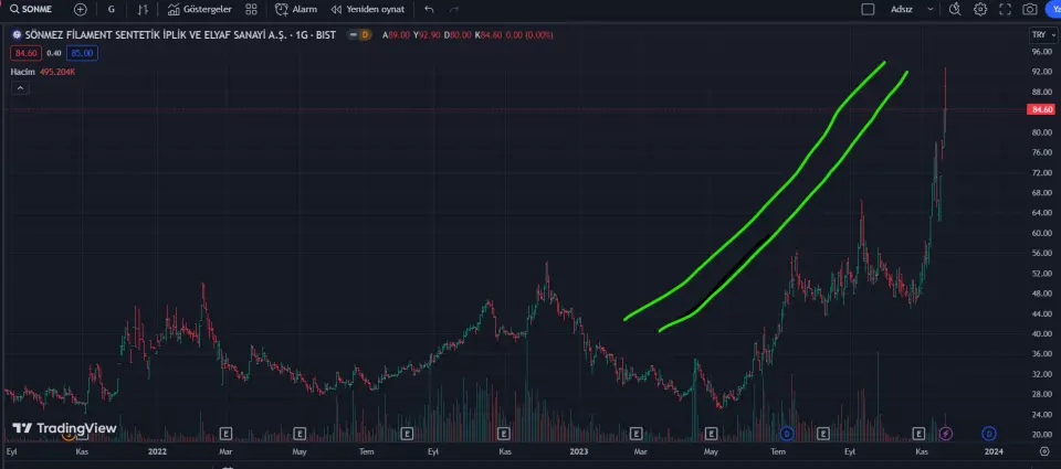Sönmez Filamet Sentetik İplik ( SONME) 22 Mayıs tarihinde 27 TL fiayat seviyelerinde işlem gören hisse 6 ay da %211 oranında primlenerek 84 TL seviyelerine çıkma başarısı gösterdi. Bugün gün içerisinde oldukça hareketli olan hisse hem tavan hemde tavan fiyatlarını görsede kapanışını dünkü fiyatla aynı kapattı. Hissede bu volatiliteye karşı Borsa İstanbul hissede 21 Aralık tarihine kadar tek fiyat işlem yöntemi tedbiri getirdi. Hissede daha önce verilmiş olan kredili işlem yasağı, brüt takas ve emir paketi tedbirleri de 21 Aralık tarihine kadar uzatıldı.