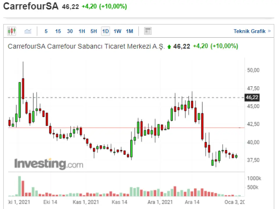 CarrefourSA hissesi yeni yıldan sonraki ilk işlem günü olan 3 Ocak ve bugün 4 Ocak'ta tavan olarak yeni yılın parlayan hissesi olarak öne çıktı.