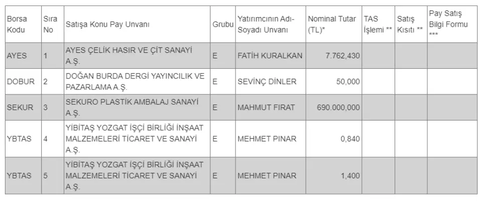Sermaye Piyasası Kurulu'nun VII-128.1 sayılı "Pay Tebliği"'nin 15'nci maddesi gereğince, pay senetleri Borsada işlem gören ortaklıkların Kurul kaydında olan ancak Borsada işlem görmeyen statüde pay senetlerinin Borsada satışa konu edilebilmesi amacıyla Merkezi Kayıt Kuruluşu'na yapılan başvurulara ait bilgiler aşağıda yer almaktadır.