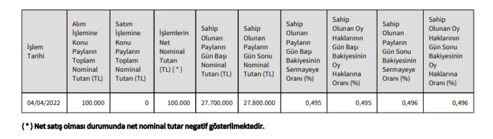04/04/2022 - 04/04/2022 tarihinde ENKA İNŞAAT VE SANAYİ A.Ş. payları ile ilgili olarak 15,86 - 16,12 TL fiyat aralığından 100.000 TL toplam nominal tutarlı alış işlemi ve/veya 0 TL toplam nominal tutarlı satış işlemi tarafımca/ortaklığımızca gerçekleştirilmiştir. Bu işlemle birlikte ENKA İNŞAAT VE SANAYİ A.Ş. sermayesindeki paylarım/oy haklarım 04/04/2022 tarihi itibariyle %0,496 sınırına ulaşmıştır /aşmıştır/altına düşmüştür. İşlemin detaylarına ilişkin bilgiler aşağıdaki tabloda yer almaktadır.