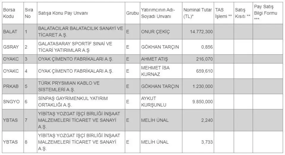 Milyonluk pay dönüşümü yapan ilgili şirketler; BALAT, GSARAY, OYAKC, PRKAB ,SNGYO ,YBTAS