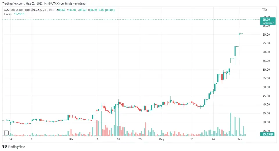 9 günde %123 prim yapan hisse olan #MZHLD Mazhar Zorlu Holding hisselerinde oldukça hareketli günler yaşanıyor. Uzun süre 30 TL bandın da yatay bir görünüm sergileyen hisse son 10 günde adeta yatay giden günlerin acısını çıkararak tavan oldu ve fiyatını 2 ye katladı.