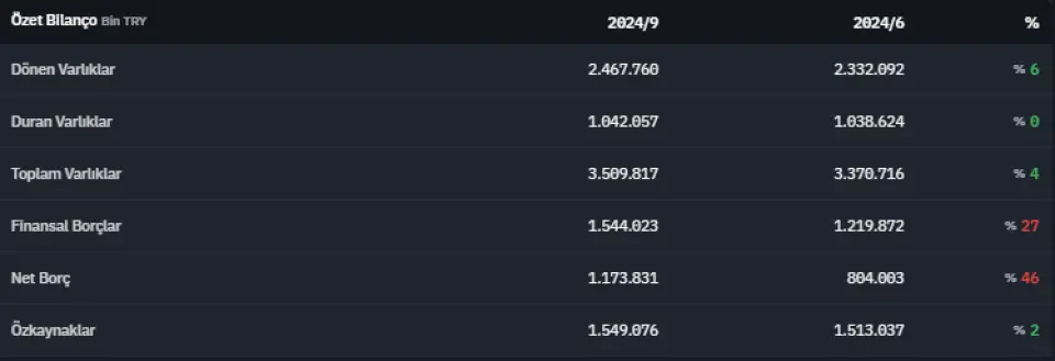 Toplam varlıklar 2024 yılının üçüncü çeyreğinde 3.509.817.000 TL olarak açıklanmıştır. 2024 yılının ikinci çeyreğinde 3.370.716.000 TL olarak açıklanan toplam varlıklar, 2024 yılının üçüncü çeyreğinde %4 artmıştır.