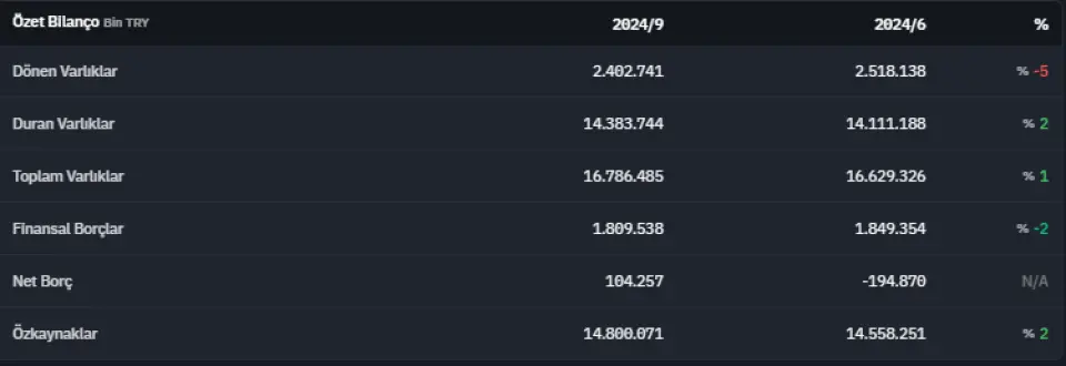 Toplam varlıklar 2024 yılının üçüncü çeyreğinde 16.786.485.000 TL olarak açıklanmıştır.
