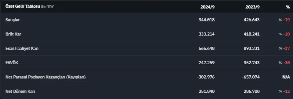 Şirket 2024 yılının üçüncü çeyreğinde 344.018.000 TL satış gerçekleştirmiştir. 2023 yılının aynı dönemine oranla satışlar %19 azalmıştır.