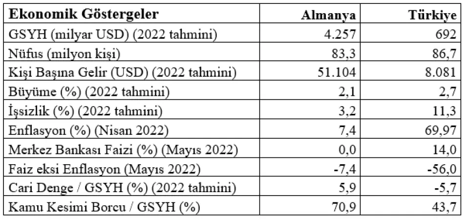 Son günlerde yurt dışında yaşayan ve Türkiye’ye ziyarete gelen yurttaşlarımız kanalıyla Almanya’nın battığı, bizim daha iyi durumda olduğumuza ilişkin bir şehir efsanesi yayıldı. Aşağıda iki ülkenin başlıca ekonomik göstergelerini karşılaştıran bir tablo bulunmakta (kaynak: IMF, World Economic Outlook Database, April 2022.)