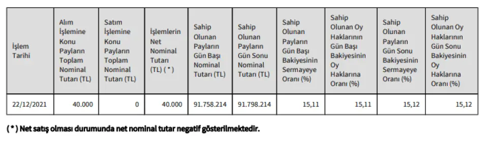 22.12.2021 tarihinde BİMAŞ - BİM BİRLEŞİK MAĞAZALAR A.Ş. payları ile ilgili olarak 65,23 TL ortalama fiyattan 40.000 TL toplam nominal tutarlı (40.000 Adet Hisse) alış işlemi tarafımızca gerçekleştirilmiştir. Bu işlemle birlikte BİMAŞ - BİM BİRLEŞİK MAĞAZALAR A.Ş sermayesindeki paylarımız/oy haklarımız 22.12.2021 tarihi itibariyle % 15,12 olmuştur.
