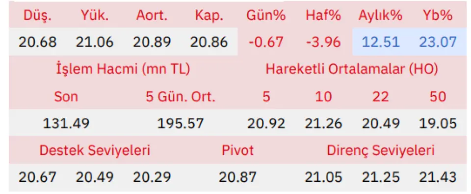 Gün içinde en düşük 20.68 en yüksek 21.06 seviyesini gören Doğan Şirketler Grubu Holding hissesinin günü %0.67 kayıpla tamamladığı gözlenmektedir. Pivot seviye 20.87 seviyesinden geçmekte olup, aşağı yönlü hareketlerde birinci destek 20.67, ikinci destek ise 20.49 seviyesinden geçmektedir. Dirençler ise sırasıyla 21.05, 21.25 seviyelerinden geçmektedir. Bu aşamada endeksin 5 günlük HO seviyesinin %0.27 altında, 22 günlük HO seviyesinin ise %1.80 üstünde hareket ettiği dikkat çekmektedir. Son gün işlem hacmi ise bu aşamada 5 günlük ortalama işlem hacminin % 32.77 altında gerçekleşmiştir.