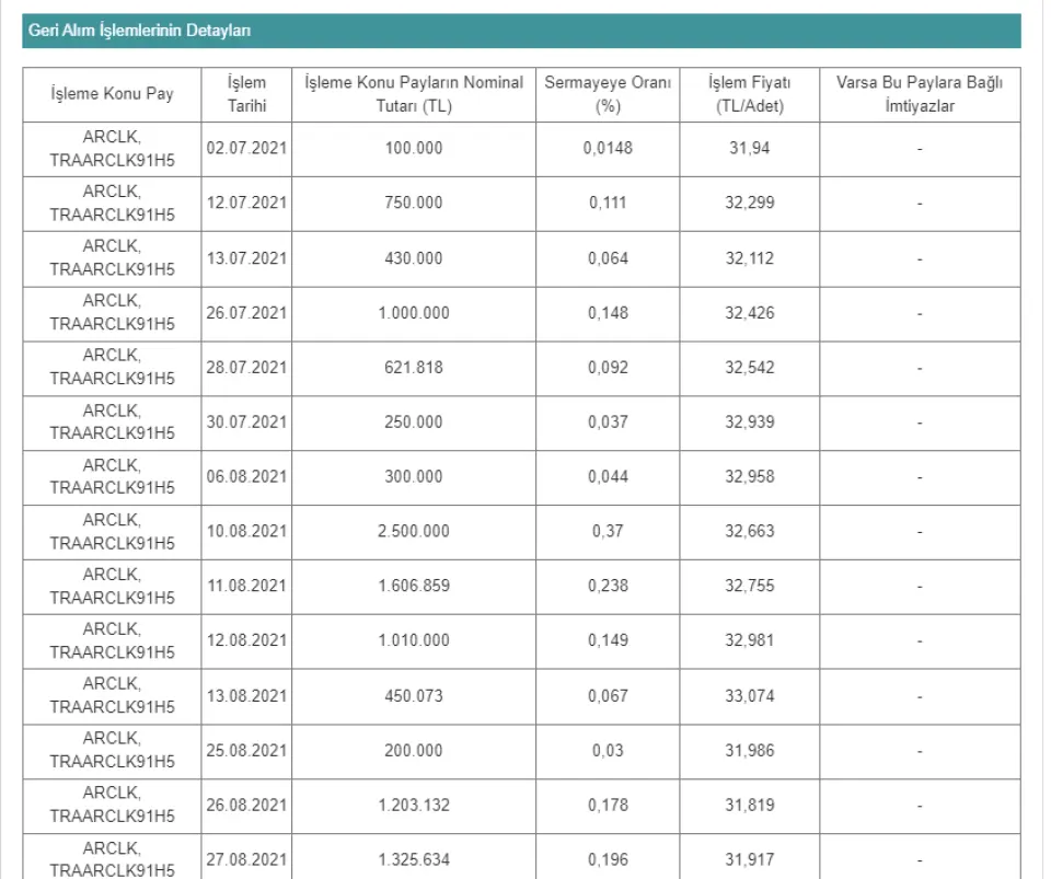 09.05.2022 tarihinde 67,65 TL - 69,50 TL fiyat aralığından (ortalama 68,5983 TL) 778.583 adet pay geri alınmış ve Şirketimizin sahip olduğu ARCLK payları 62.954.888 adete ulaşmıştır. (Şirket sermayesine oranı %9,3166)