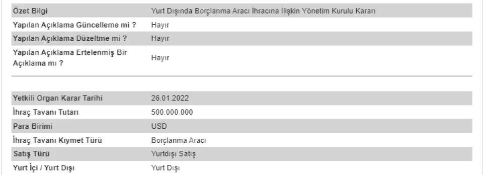 Şirketimiz Yönetim Kurulu'nun 26 Ocak 2022 tarihli toplantısında; yatırımlarımızın ve işletme sermayesi ihtiyacının finansmanı amacıyla, tamamı yurt dışında satılmak üzere, çeşitli tertip ve vadelerde, ihraç tarihlerindeki piyasa koşullarına göre belirlenecek sabit ve/veya değişken faiz oranlarında toplamda 500.000.000 USD (beş yüz milyon Amerikan Doları) tutarına kadar Borçlanma Aracı (Eurobond) ihracı yapılmasına, bu kapsamda aracı kuruluşların yetkilendirilmesi için çalışmalara başlanmasına, Sermaye Piyasası Kurulu ve ilgili diğer kurum ve kuruluşlar nezdinde gerekli başvuruların yapılmasına, ihraca ilişkin koşulların belirlenmesi ve satışın gerçekleştirilmesi dahil tüm işlemlerin yapılması hususunda üst yönetimin yetkilendirilmesine karar verilmiştir.