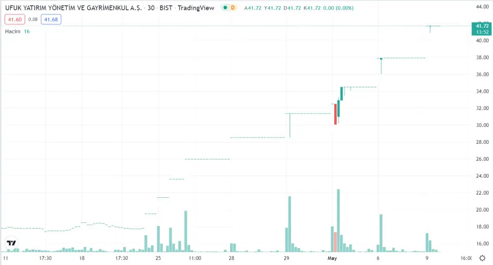 Alt Pazarda işlem görmeye başlayan Ufuk yatırım bu değişiklikten sonra yatırımcının yüzünü güldürdü. Pazar değişiklik kararının onaylanması sonrası hissedeki hareket başladı 17.5 TL’den harekete başlayan hisse 41 TL’ye kadar yükselme başarısı gösterdi. 8 tavan giden hissede yükseliş trendi devam ediyor. Hisse bugünde tavan !