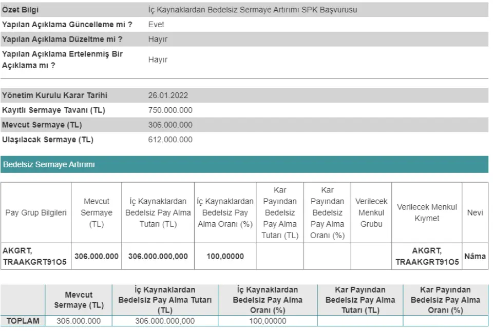 26.01.2022 tarihli özel durum açıklamamıza ilişkin olarak; Şirketimiz 09.02.2022 tarihli Yönetim Kurulu kararı çerçevesinde, Sermayeye Eklenecek Satış Karları hesabından 90.989.327 TL ve Olağanüstü Yedekler hesabından 215.010.673 TL olmak üzere iç kaynaklardan toplam 306.000.000 TL'lik tutarın 08.02.2022 tarihinde ilgili hesaplardan Şirket sermaye hesabına aktarıldığını Yılmaz Ay Yeminli Mali Müşavir'inin 09.02.2022 tarihinde düzenlenen mali müşavir raporu ile tespit edilmiş olup, artırılan 306.000.000 TL'lik sermayeyi temsilen paylara ilişkin İhraç Belgesi'nin onaylanması Şirketimiz Esas Sözleşmesi'nin 8'inci maddesinde yapılması gereken değişikliğe gerekli izin ve onayların alınması şartıyla, Esas Sözleşme'nin 8'inci maddesinin yeni şeklinin genel kurul kararı aranmaksızın tescil ve ilân edilmek üzere yeni şekline uygun görüş verilmesi için Sermaye Piyasası Kurulu'na 15.02.2022 tarihinde (bugün) başvurulmuştur.