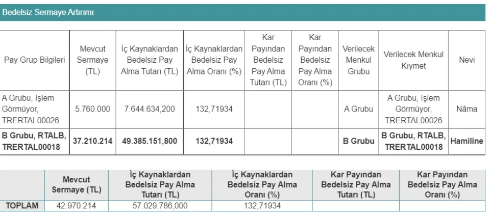 Şirketimiz Yönetim Kurulu'nun 16.03.2022 tarihli toplantısında, Şirketimizin 100.000.000 TL kayıtlı sermaye tavanı dahilinde 42.970.214 TL olan çıkarılmış sermayesinin, tamamı iç kaynaklardan karşılanmak suretiyle 57.029.786 TL (%132,72 oranında) artırılarak 100.000.000 TL'ye çıkarılmasına, iç kaynaklardan karşılanacak olan 57.029.786 TL tutarındaki sermayenin 52.876.395 TL tutarındaki kısmının emisyon primlerinden, 4.153.391 TL tutarındaki kısmının ise geçmiş yıllar karlarından karşılanmasına karar verilmiştir.