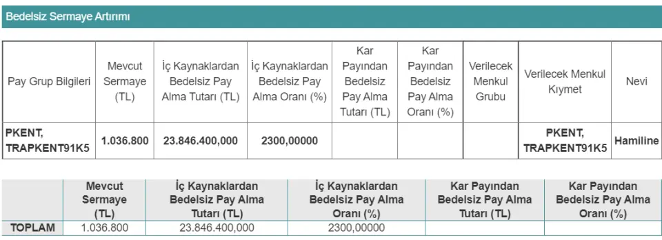 Bedelsiz onayı için başvurusunu yapan şirket onay için bekliyor. Bu şirket sene başından beri kazancı %744 artarken haftalık kazancı %52 arttı. #Pkent şirket Yatırımcının yüzünü kısa zamanda güldüren şirketler arasında yer alıyor. Borsamızda düşüş devam ederken yatırımcıların en çok merak ettiği konulardan biriside bedelsiz ve bedelli sermaye. Şirket en son 2004 yılında bedelsiz sermaye artırımı yaptı o zaman yaptığı bedelsiz sermaye artırımı da %400 olarak gerçekleşti.