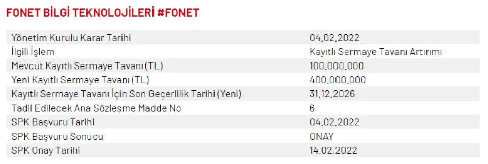 FONET BİLGİ TEKNOLOJİLERİ #FONET'den rekor sermaye tavanı artırımı! TAM 4 KATI!