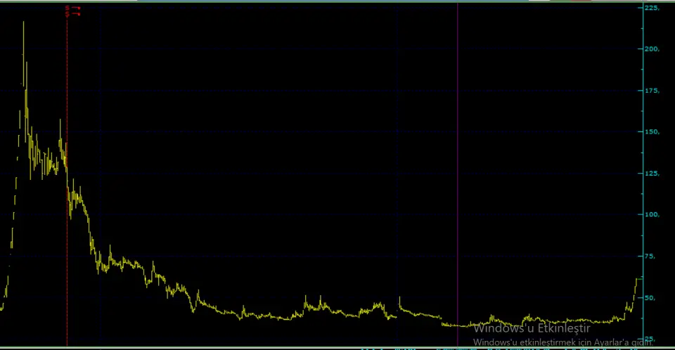2020 yılının Ekim ayında gördüğü 216 tl zirvesinden beri, düşen trende giren hisse, bu sene Mart ayında 32 tl civarında dip fiyatlara kadar düştü.