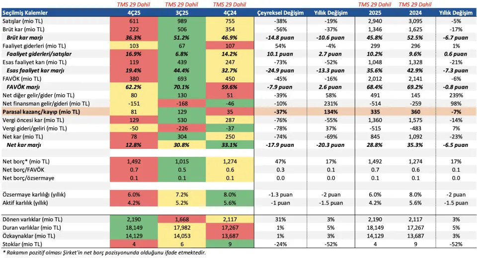 "Şirket, 80 milyon TL seviyesinde net diğer gelir (4Ç24: 51 milyon TL net gelir) ve 151 milyon TL seviyesinde net finansman gideri (4Ç24: 46 milyon TL net finansman gideri) kaydetti. 2025 yılında net finansman gideri net diğer gelir geçtiğimiz seneye oranla yaklaşık iki kat arttı. Buna karşılık net diğer gelir net diğer gelir kalemi %239 artışla 491 milyon TL olarak gerçekleşti."