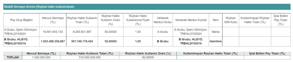 Mevcut ortakların yeni pay alma haklarının (rüçhan hakkının) kısıtlanmamasına, yeni pay alma haklarının 1 TL nominal değer üzerinden kullandırılmasına ve yeni pay alma hakkının kullanılmasında 1 TL nominal değerli bir payın satış fiyatının 1 TL olarak belirlenmesine,