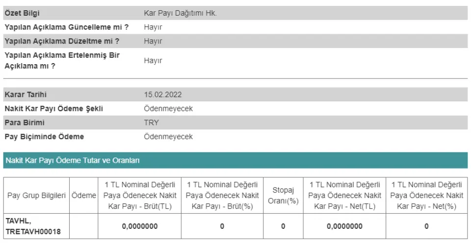 | Şirketimiz, 01 Ocak 2021 - 31 Aralık 2021 tarihleri arasında gerçekleştirdiği faaliyetler sonucunda, Sermaye Piyasası Kurulu'nun Seri:II, No:14.1 sayılı "Sermaye Piyasasında Finansal Raporlamaya İlişkin Esaslar Tebliği" hükümleri uyarınca hazırlanmış olan bağımsız denetimden geçmiş konsolide finansal tablolara göre, 467.689.000 TL net dönem kârı elde etti.2021 yılında şirketimizin uzun vadede gelişmesi için satın aldığımız Almatı Havalimanı'nın ve kazandığımız Antalya Havalimanı işletme imtiyazı ihalelerinin ve bu işlemlerle ilgili yatırımların doğurduğu kaynak ihtiyaçları nedeniyle, 2021 mali yılı için yapılacak olan Olağan Genel Kurul Toplantısında ortaklarımızın onayına sunulmak üzere, Şirketimizin Kâr Dağıtım Politikasına uygun olarak, kâr payı dağıtımı önerisi yapılmamasına oy birliği ile karar verilmiştir. |