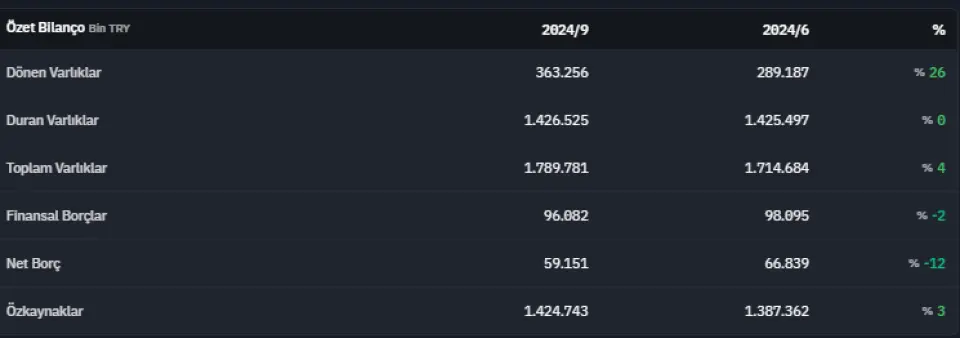 2024 yılının üçüncü çeyreğinde net borç 59.151.000 TL olarak açıklanmıştır.