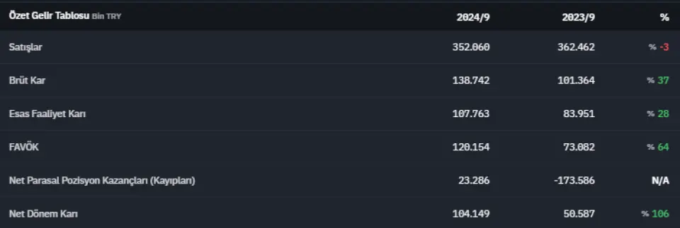 Net dönem kârı ise 104.149.000 TL olarak kaydedildi. İlgili verinin 2024 yılının üçüncü çeyreğinde 2023 yılının aynı dönemine oranla %106 arttığını söyleyebiliriz.
