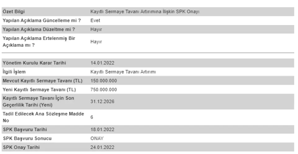 1. Sermaye Piyasası Kanunu'nun 18'inci maddesi hükmü ve Sermaye Piyasası Kurulu'nun, II.18-1 sayılı Kayıtlı Sermaye Sistemi Tebliği çerçevesinde yapılan değerlendirme neticesinde; mevcut kayıtlı sermaye tavanımıza ulaşılmamış olsa da, Şirketimiz hedeflerine ulaşması için yeterli olmadığına, 2022-2026 yılları için Şirketimiz mevcut 150.000.000.- TL (YüzelliMilyonTürkLirası) kayıtlı sermaye tavanının 750.000.000.- TL(YediyüzelliMilyonTürkLirası)'na artırılmasına karar vermiştir.