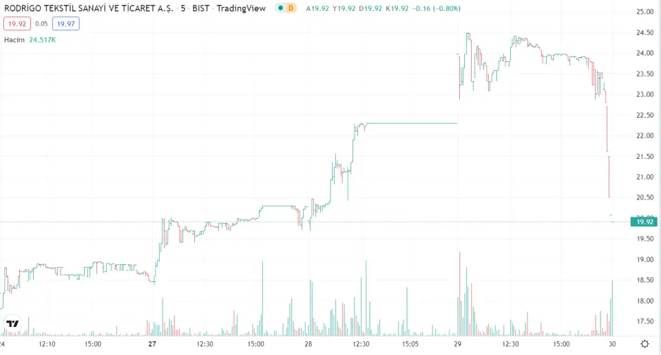 Son günlerin iniş ve çıkışlarıyla gündemde olan hissesi Rodrigo Tekstil iki günde yaklaşık %20 değer kaybetti. Borsa İstanbul'un yapmış olduğu açıklamada VBTS kapsamında 30 gü...