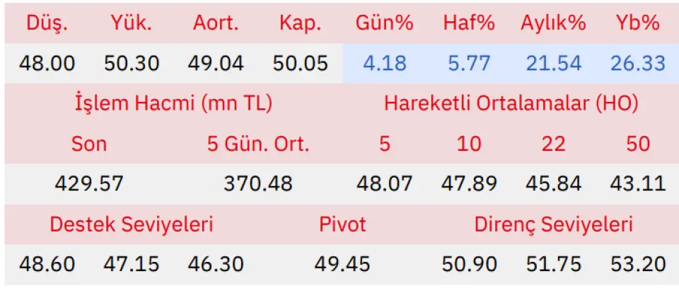 Gün içinde en düşük 48.00 en yüksek 50.30 seviyesini gören İş Yatırım Menkul Değerler hissesinin günü %4.18 kazançla tamamladığı gözlenmektedir. Pivot seviye 49.45 seviyesinden geçmekte olup, aşağı yönlü hareketlerde birinci destek 48.60, ikinci destek ise 47.15 seviyesinden geçmektedir. Dirençler ise sırasıyla 50.90, 51.75 seviyelerinden geçmektedir. Bu aşamada endeksin 5 günlük HO seviyesinin %4.12 üstünde, 22 günlük HO seviyesinin ise %9.19 üstünde hareket ettiği dikkat çekmektedir. Son gün işlem hacmi ise bu aşamada 5 günlük ortalama işlem hacminin % 15.95 üstünde gerçekleşmiştir.