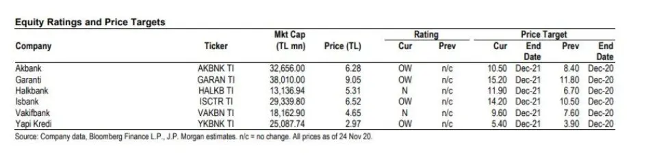 JP Morgan, bazı Türk hisselerinde hedef fiyat ve tavsiye değişiklikleri yaptı. Bankanın 25 Kasım tarihinde yayınladığı raporundaki hedef fiyatı güncellemeleri şu şekilde: