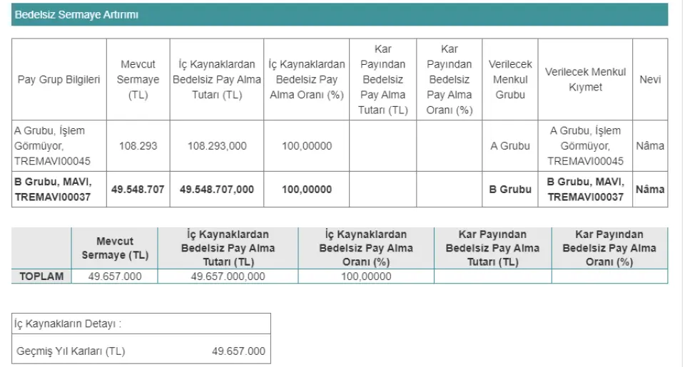 Borsa İstanbul'da işlem gören hisselerden Mavi Giyim Sanayi %100 bedelsiz kararı genel kurulda alındı. Borsa İstanbul'da bedelsiz kararı veren şirketin bedelsiz oranı geçmiş yıl kârlarında karşılanarak sermayeye eklenmesi kararlaştırıldı. Süreç Yönetim kurulunda onaylandı. Tüm detayları ile... Mavi rekor bedelsiz kararı