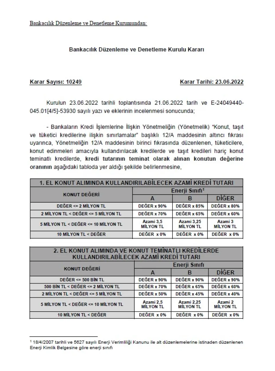 Enerji sınıfı A olan 2. el konutlar için kredi değer oranı; konut değeri 500 bin TL'nin altında olan konutlar için yüzde 90, konut değeri 500 bin TL ile 2 milyon TL arasında olan konutlar için yüzde 70, konut değeri 2 milyon TL ile 5 milyon TL arasında olan konutlar için yüzde 50, konut değeri 5 milyon TL ile 10 milyon TL arasında olan konutlar için azami 2,5 milyon TL oldu.