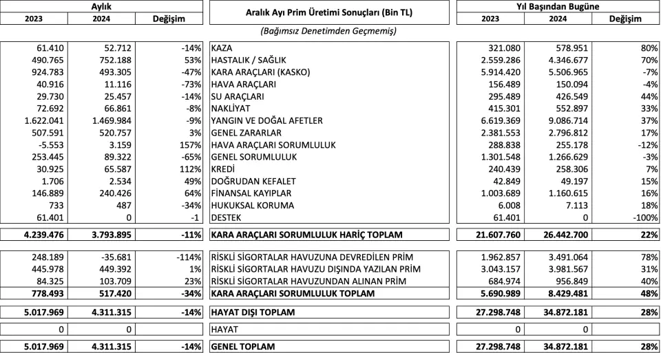 "Şirket’in açıkladığı veriyi branş bazlı incelediğimizde; 2024 döneminde geçen yılın aynı dönemine kıyasla, sağlık grubunda %70 büyüme görülürken, yangın ve doğal afetler grubunda %37 ve kazada %80 artış yaşanmıştır."